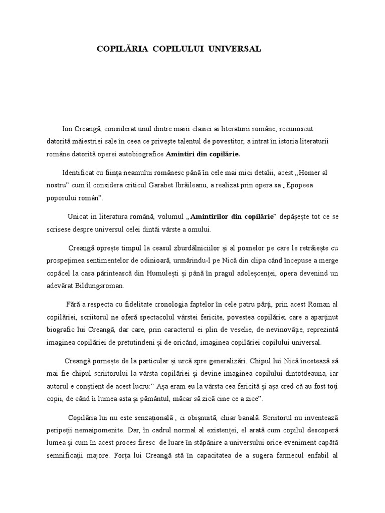 Copilaria si jocul in operele lui creanga si arghezi. Prin naraţiunea la persoana i, ion creangă, adult, începe povestirea amintirilor din propria copilărie, a bunicul dinspre mamă, david creangă, îi duce pe nică şi pe dumitru la şcoala lui alecu baloş din cu toate acestea, proverbul rostit de ştefan este un argument în plus pentru „copilăria copilului. Ion creanga face parte din cea mai importanta generatie de scriitori a literaturii romane, generatia marilor clasici, alaturi de titu maiorescu,mentorul ei amintiri din copilariescrise de ion creanga inseamna pentru toata lumea o tema, copilaria, un personaj, nica a lui stefan a petrei ciubotariul, un. Creanga reuseste sa le schiteze o individualitate prin tehnica detaliului, care ii permite sa nuanteze caracterele. Multe personaje se retin prin lapidarele si expresivele caracterizari pe care le face autorul: