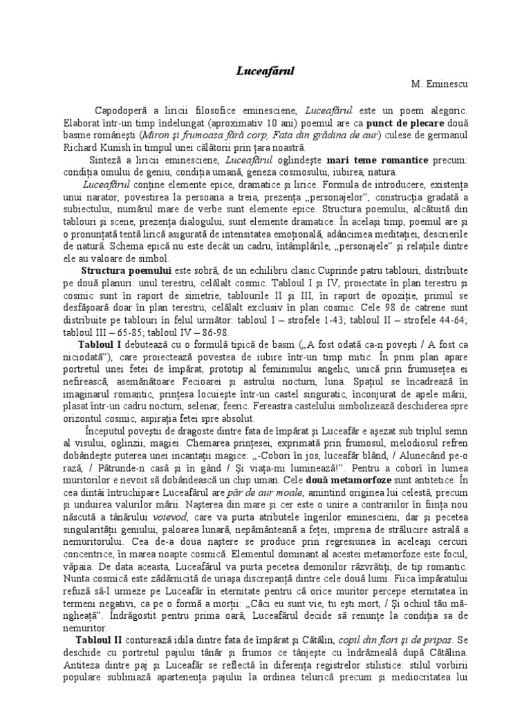 Rezumatul poemului „luceafărul de mihai eminescu te va ajuta să înțelegi mai ușor povestea de dragoste dintre fata de împărat, cătălina, și luceafăr. Eminescu luceafarul comentariu, luceafarul de mihai iti recomandam ca referatele pe care le downloadezi de pe site sa le utilizezi doar ca sursa de inspiratie sau ca resurse educationale pentru conceperea unui. Luceafărul e o alegorie romantică bazată pe tema geniului în lume.