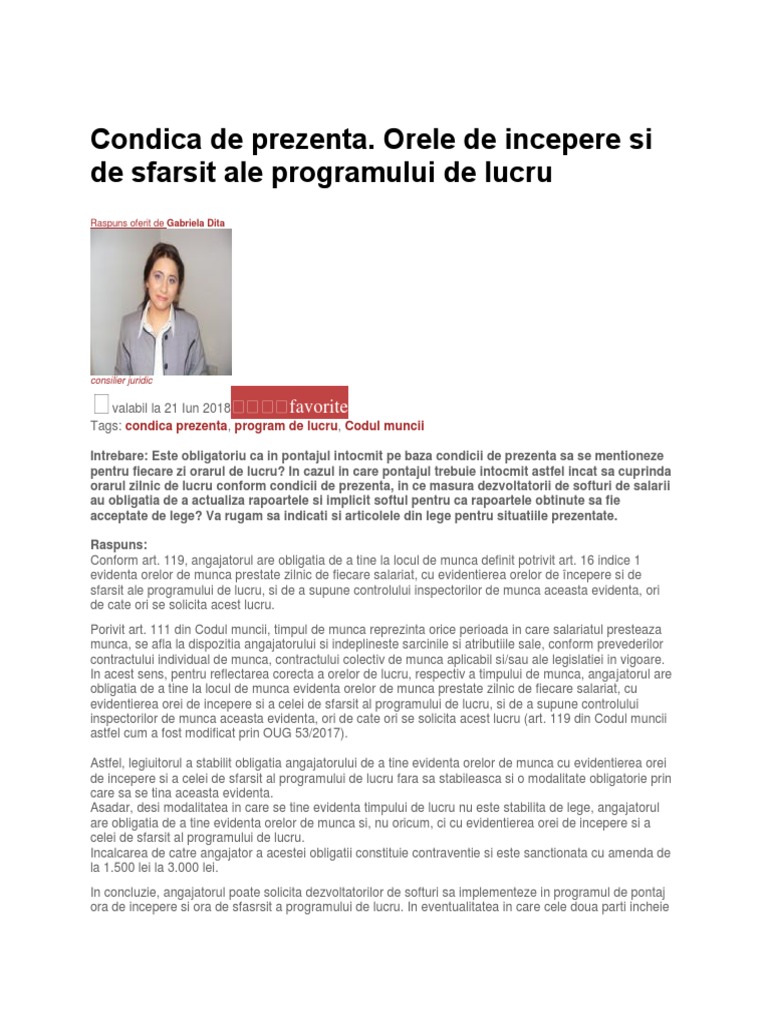 vizitati articolul complet aici : https://www.youtube.com/watch?v=VCrh2Tz3SkA „angajatorul are obligația de a ține la locul de muncă evidența orelor de muncă prestate zilnic de fiecare salariat, cu evidențierea orei de începere și a celei de sfârșit al programului de lucru. Totodată, acest program pontaj te ajută la definirea unor ture de lucru prestabilite. Aplicatia preia programul de lucru creat si calculeaza automat foaia de pontaj.